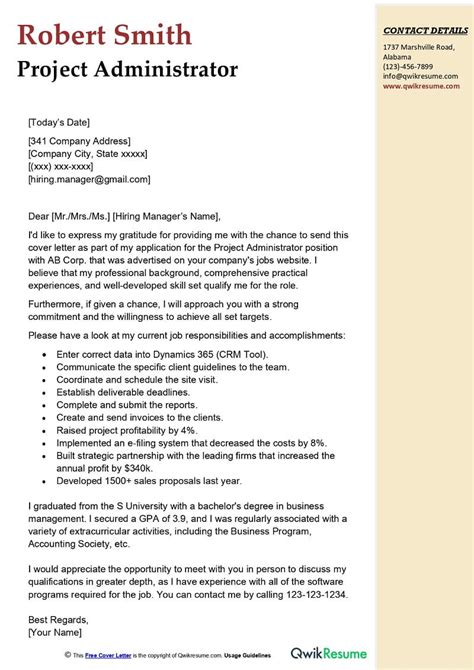 application letter sample for a project administrator