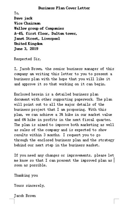 business plan letter sample
