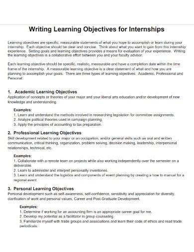 learning objective examples for internships
