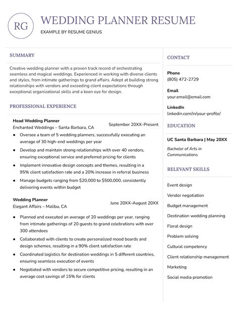 wedding planner resume sample